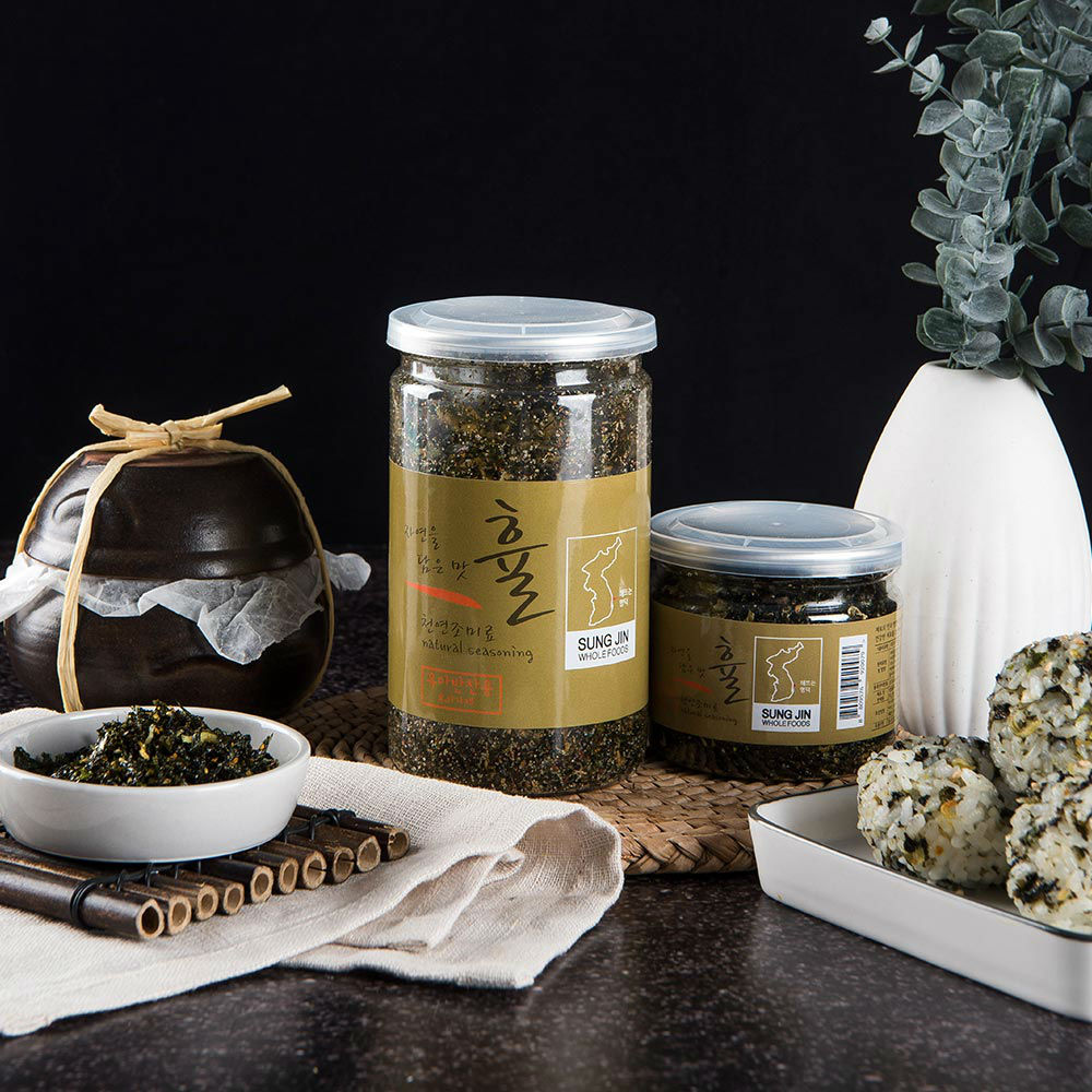 • Ingredients: dried bonito, laver, anchovy, shrimp, carrot, green onion, olive oil, sesame, black sesame, sugar, salt