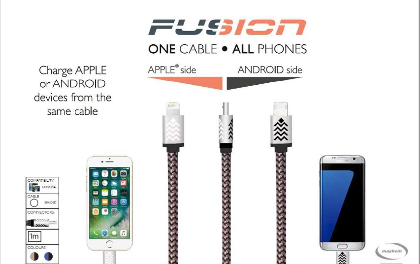 • The Fusion Cable is the world's first Dual sided connector cable. One side charges Apple phone, the other side charges Android phone. No add ones, no unreliable clips and no gimmicks. Just one dual sided connectors for ALL phones.