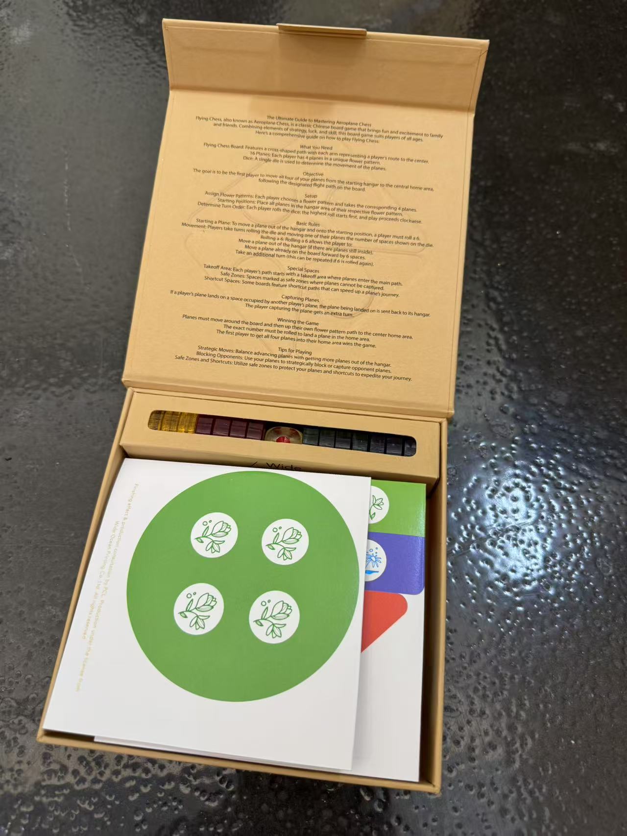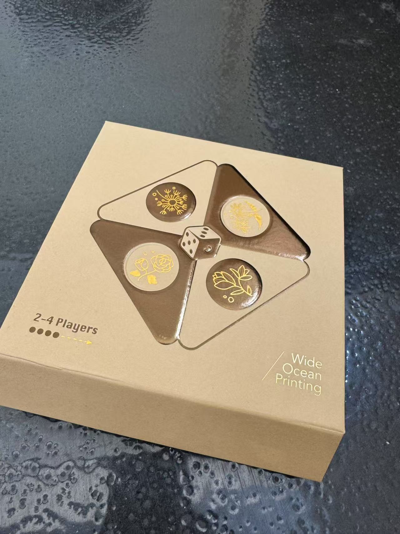 This is a classic flying chess game set. The base is crafted with paper assembly, enhanced by hot stamping and special finishing for an elegant look. It comes with durable plastic chess pieces, suitable for all ages and used as a leisure game, a lovely souvenir or an educational tool.
