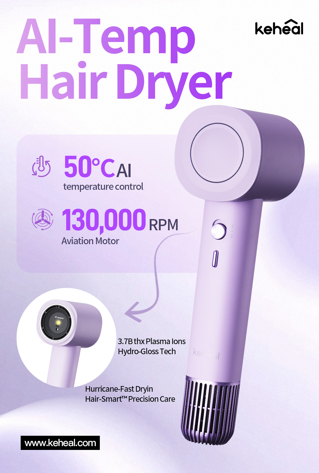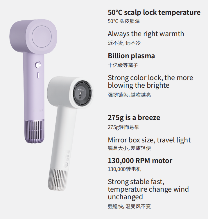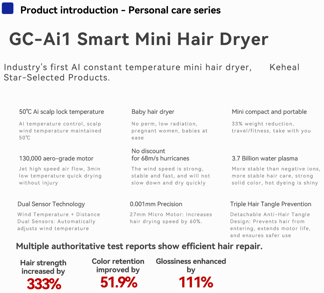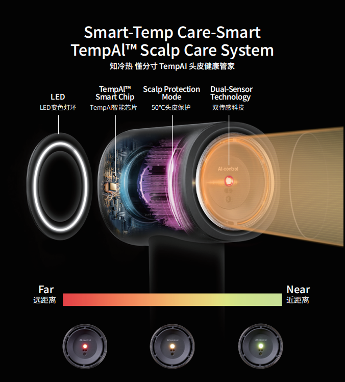 1, Ai intelligent temperature control, temperature distance dual sensing, so that the wind temperature touching the scalp to maintain stability