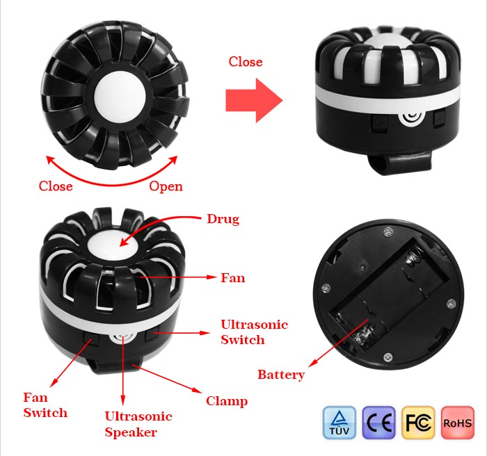 Mode 1: sonic wave. Push up the switch with speaker, and the item will emit sonic wave which can irritate the mosquito nervous system to make them painful and discomfortable and then flee away.