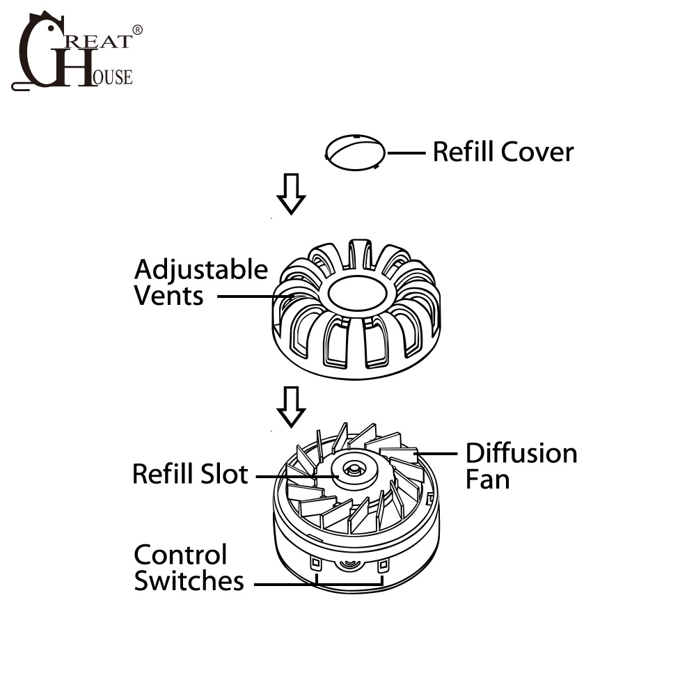 Note: under mode 2, please rotate the top cover and you will see the fans and this will help the smell spread. One piece absorbent pad can be used for 15 days.