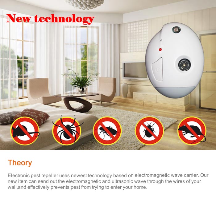 Our new item can send out the electromagnetic and ultrasonic wave through the wires of your house,and effectively prevents them from trying to enter your home.The variable electromagnetic wave and 23-45 KHZ ultrasonic frequency attack the auditory and nervous systems of most common pests like rat,mouse,cockroach,bedbug,spider etc causing them pain and discomfort.