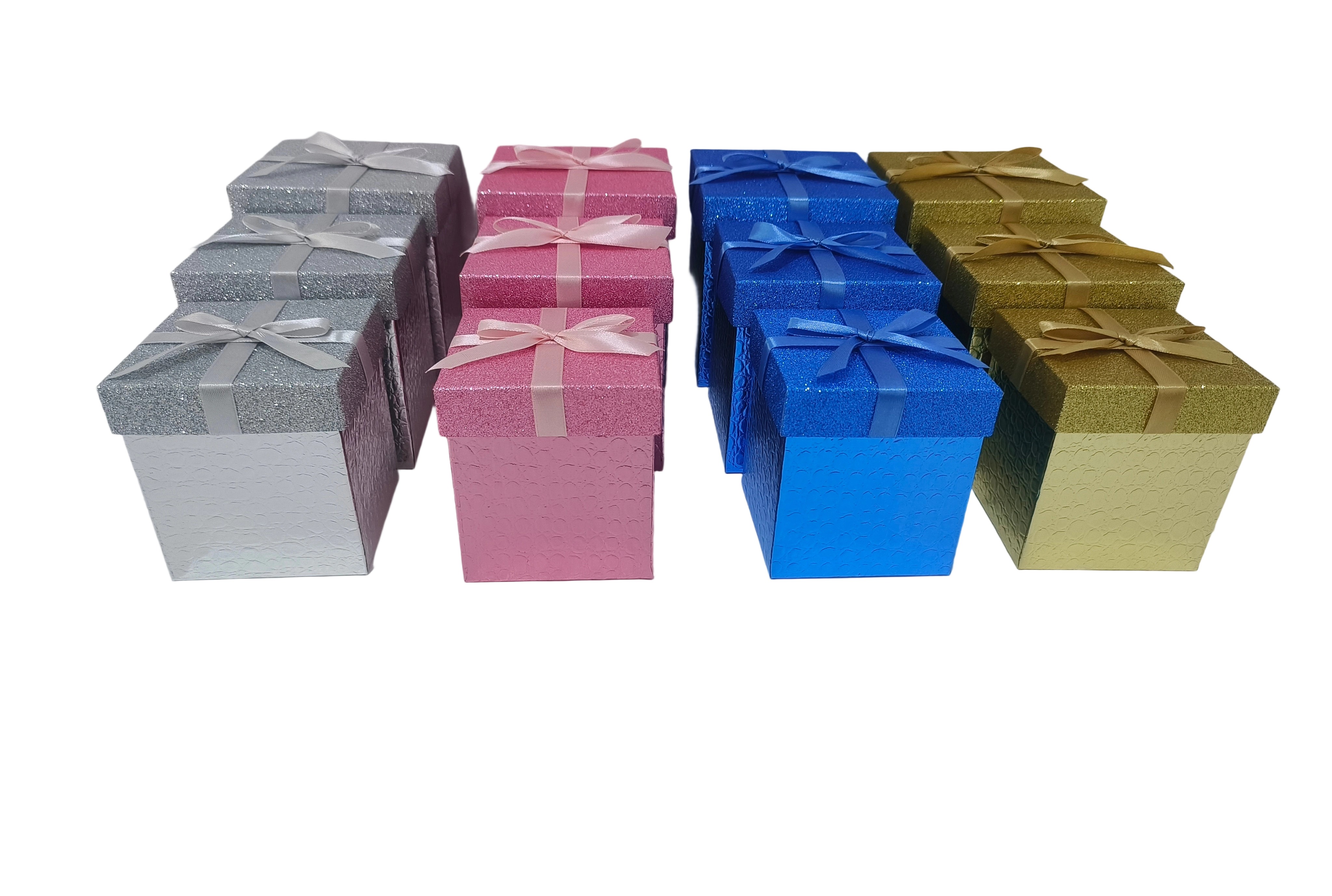 GIFT BOXES, MADE OF RECYCLED PAPER CARDBOARD WITH 1 COLOR INSIDE, BASE BOX IS FOIL PAPER WRAPED, LID IS GLITTERY PAPER WRAPED WITH RIBBON BOW