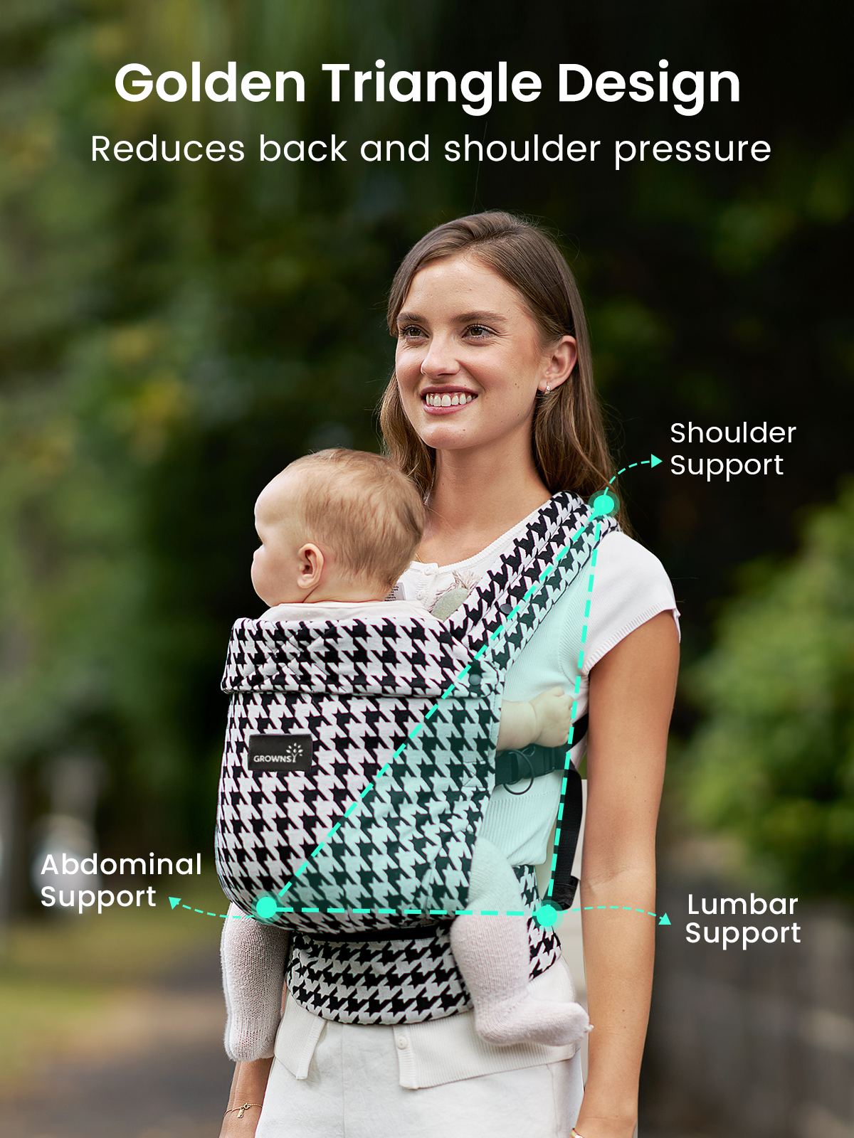 Ergonomic Structure: GROWNSY baby carrier newborn designed with three-point support system and widened shoulder straps, it can minimize pressure on the shoulders and back. EVA Waist Support and X-Shaped back support can transfer and evenly distribute the pressure on the back. You won't feel tired even after wearing it for a long time, providing comfort for parents
