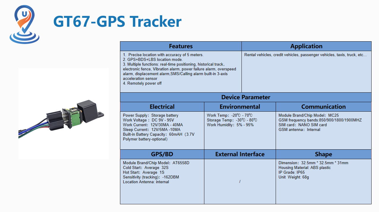 3. Multiple functions: real-time positioning, historical track, electronic fence, Vibration alarm, power failure alarm, overspeed alarm, displacement alarm,SMS/Calling alarm built-in 3-axis acceleration sensor.