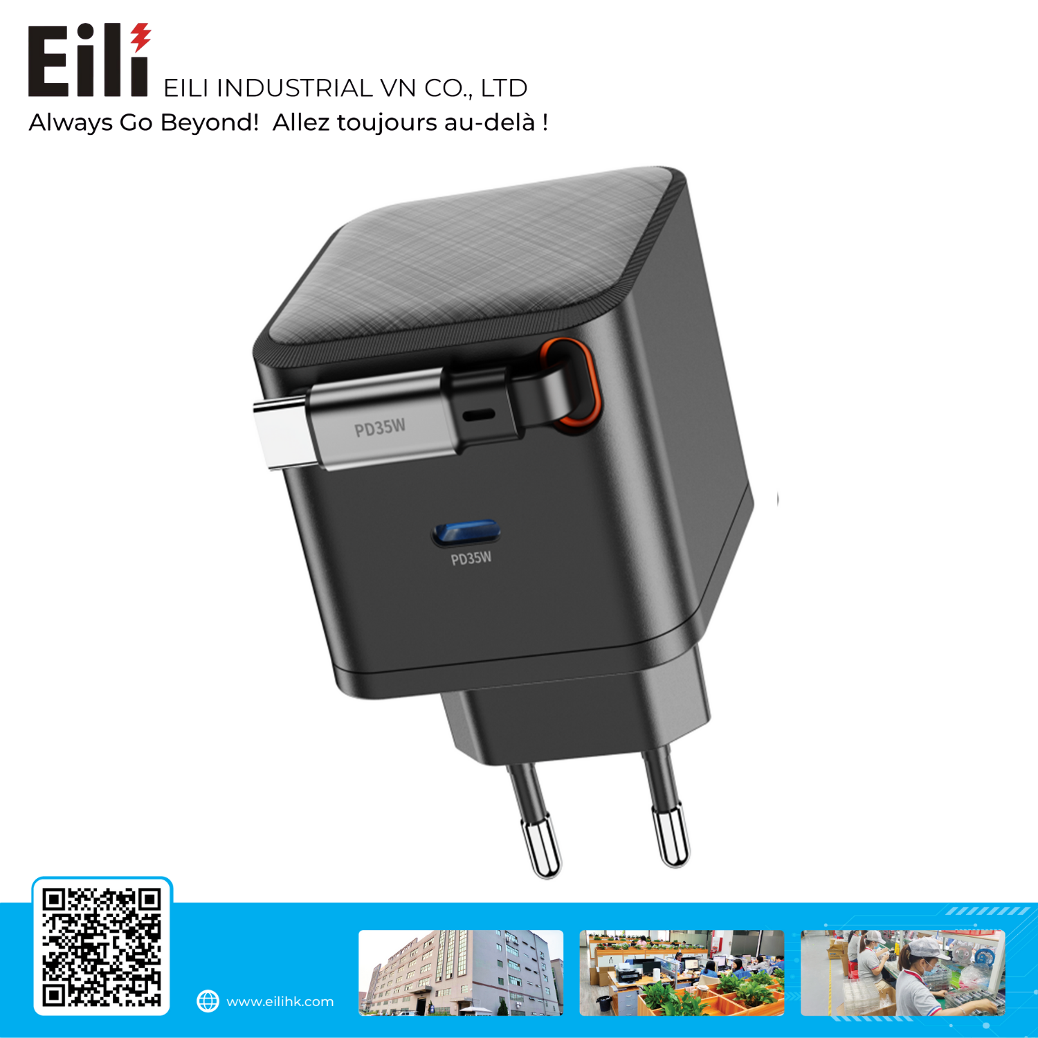 The 35W GaN Charger with retractable USB-C cable and an extra USB-C port offers fast and convenient charging for multiple devices. Its retractable cable design keeps your workspace or travel bag tidy, prevents tangling, and enhances portability. With PPS support and intelligent power distribution, it ensures safe and efficient charging for smartphones, tablets, and other USB-C devices.