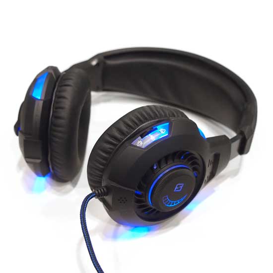 These black headphones are ideal for playing games. They feature a padded headband and soft ear cushions. The blue light design lends a cool touch to the look.