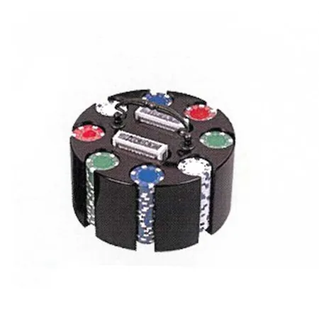 This set includes 200 gaming chips, 2 decks and a round holder. The high-quality chips come in 3 different colors. The holder features a top handle for comfortable carriage.