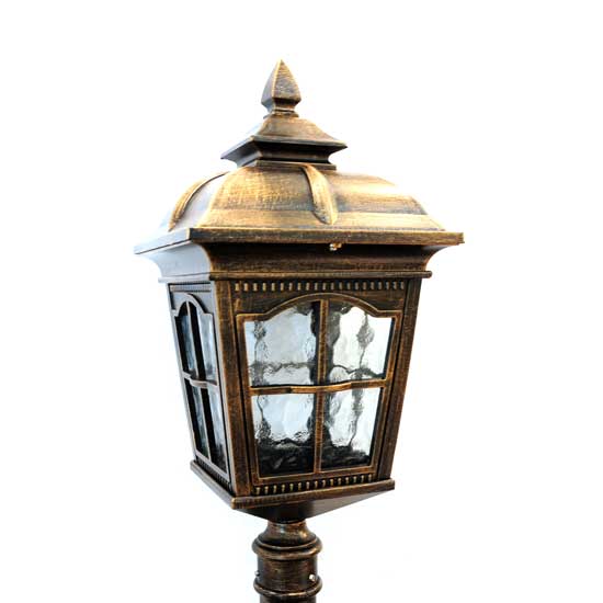 This garden lamp features an elaborate shape with a bronze-tone housing that lends a vintage touch. It consumes 100 watts of energy and delivers excellent lighting distribution. Designed with IP44 protection, the garden lamp is ideal for outdoor use.