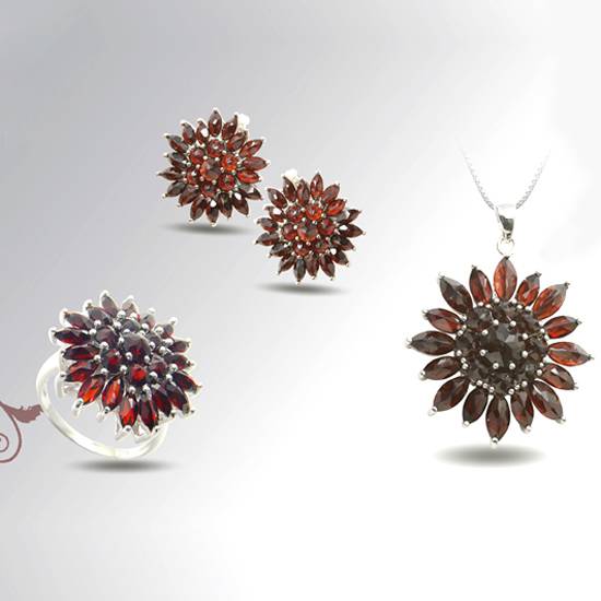 This is a series of garent jewellery in the motif of sunflowers. The garent sunflower is of a reddish brown color and a cool shape inspired by the natural beauty of flowering plants. Due to its unique color, the rings and pendant are good for all occasions like parties, balls and dinner gatherings.