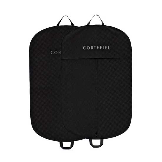 This high-quality garment bag keeps your clothes neat and tidy. The simple black surface of the bag has printed text. This well-constructed garment bag guarantees a long service life.
