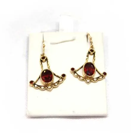 These pretty dangling earrings feature unique fan-shaped design. The jewelry pieces highlight oval-cut garnet stones in an intense ruby color. The highly polished finish adds a distinctive look of elegance to the beautiful earrings.