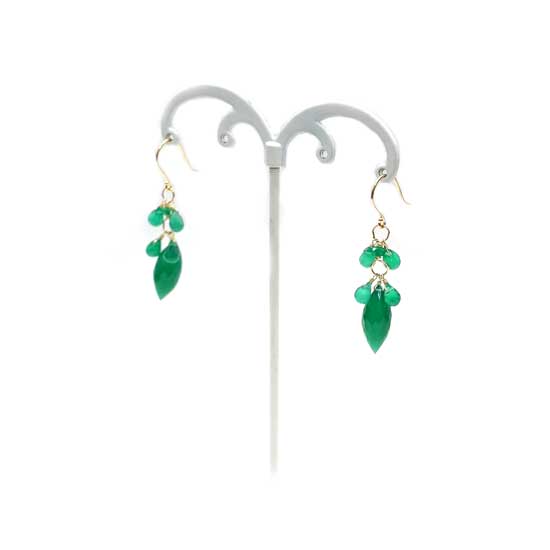 This is a pair of gem earrings featuring green onyx. The dangles are embellished with round stones for a dynamic and fashionable look. These earrings use a 14K gold hook for durability and easy wearing.