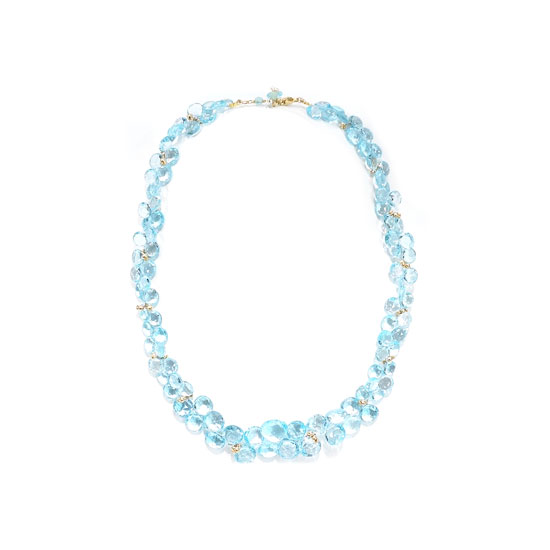 This is a gem necklace that features blue topaz. The jewels are finely cut and polished for a natural luster. This beautiful gem necklace uses a 14K gold clasp for durable wearing.
