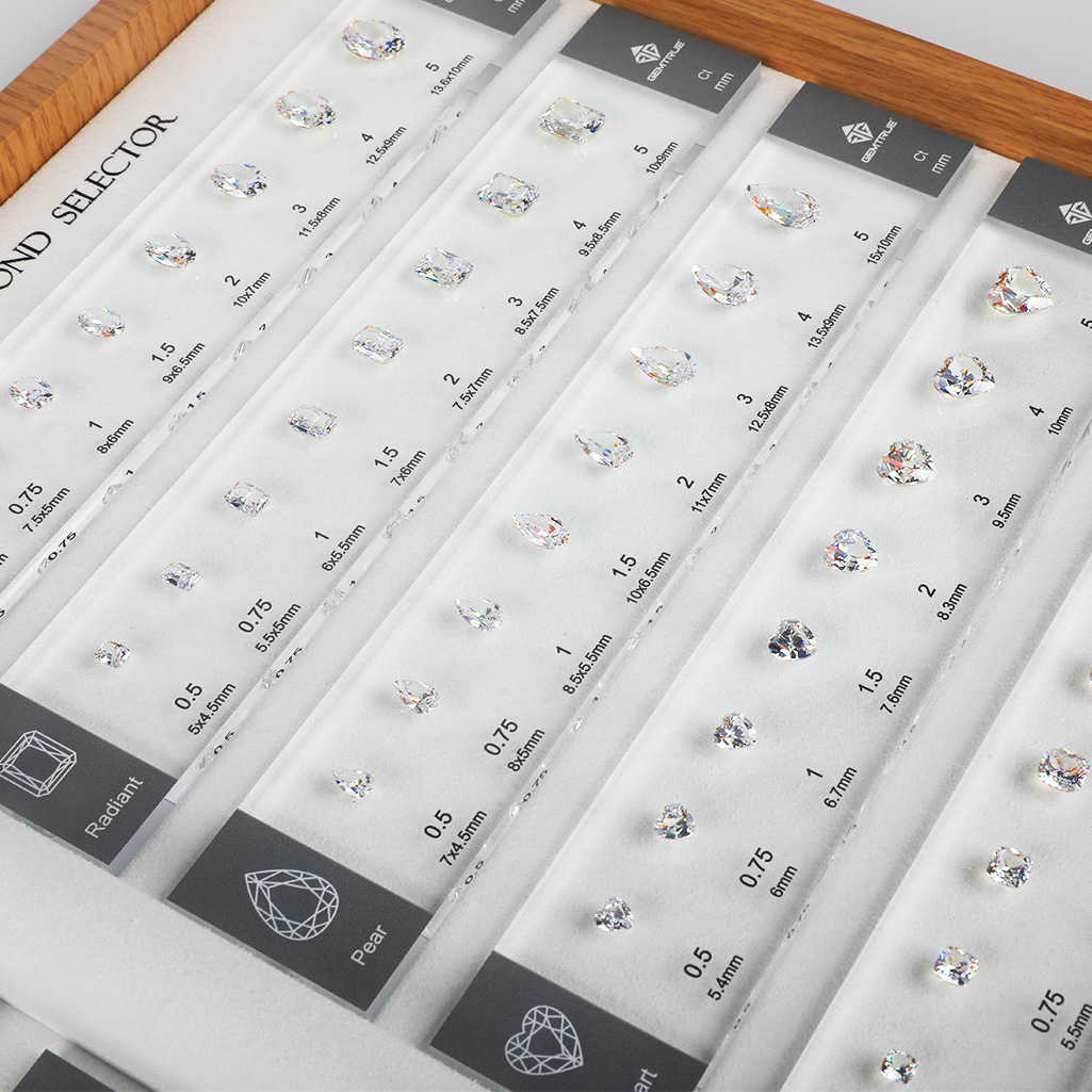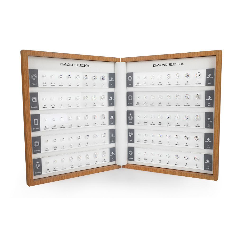 The GemTrue Diamond Selector is a premium tool designed to simplify the process of selecting the perfect diamond size and shape. Featuring 5mm high-grade acrylic strips with 8 9A top-quality CZ stones per strip, this innovative kit makes it easy to visualize diamonds and their fit on your hand. Packaged in an elegant wooden box with a magnetic closure, it combines style, durability, and practicality for jewelers and customers alike.