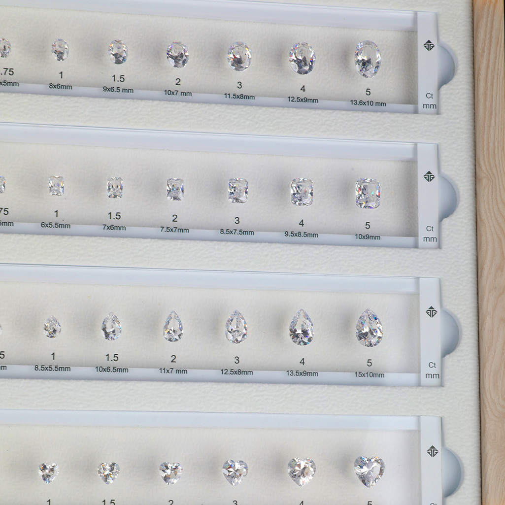 The GemTrue Diamond Selector is an innovative solution for jewelers, gem dealers, and anyone seeking the perfect diamond size and shape. This elegantly designed kit features 3mm acrylic strips with 8 high-quality CZ stones per strip, all packaged in a sophisticated wooden-color box.