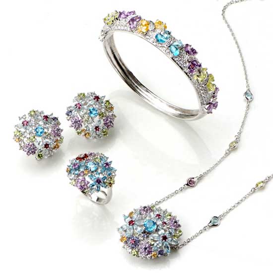 Highlighted here is a luxurious jewelry set with a pendant, bangle, ring, and pair of earrings in natural styling. The colorful gemstones in flower and butterfly designs remind you of the beautiful spring. This fancy gemset jewelry set makes a great gift idea for the elegant ladies.