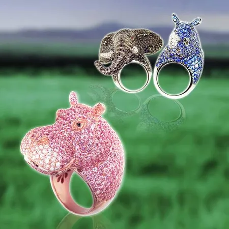 These are gemstone rings with large heads of animals. The colours of the stones used are carefully chosen to produce a vivid appearanc for each animal head.