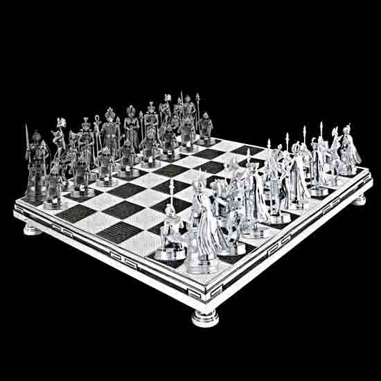 The silver chess set comprises of 32 highly detailed and outstanding pawns in silvery and black colors. It comes with a silver board with CZ stones for added style. The precious chess set reflects the glory of the European historical period.