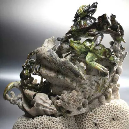 Displayed is a gemstone decoration that is hand-carved. Made from a whole piece of gem, this decoration shows the scene of sea turtles on the rock, with corrals and seashells at the bottom of the rock. This beautiful gemstone decoration is a unique choice.