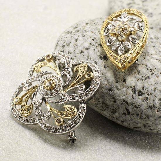 These are jewellery brooches made of gold, silver and colourless stones. Each of them has a openwork design and colourless radiant stones with channel setting.