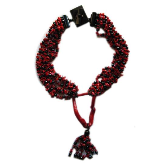 This gemstone necklace with corals and onyxes is in multi-strand design. It is hand made with sophistication and it has a unique and rare Mediterranean coral center circle for holding the tassel pendant. The red coral and the black onyxes are threaded evenly.