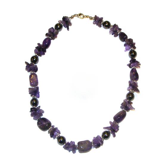 The featured jewellery is a gemstone beaded necklace strung with round black hermite in between irregular purple amethyst beads. The dark tone gives the necklace a mystic and noble look which is great for matching elegant wear.