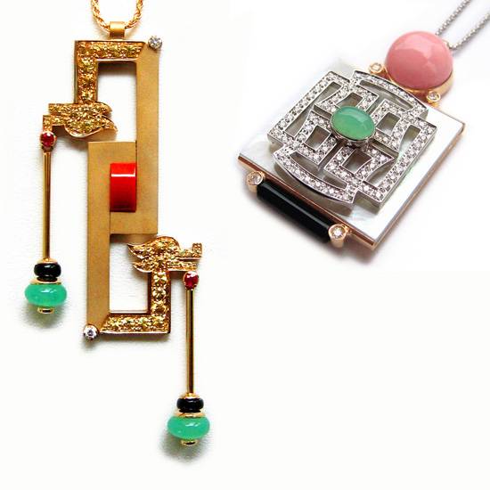 These pendants are in Deco Collection with diamonds and other gemstones. They are in different designs and all are made of gemstones, including diamonds, jades and corals. Besides the gemstones, the pendants are also embellished by 18K gold for enhancing the elegance and the luxurious style.
