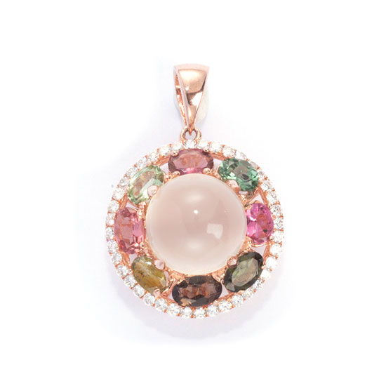 This is a gemstone pendant that comes in a colorful design. Using finely polished moonstone and tourmaline, this pendant has a natural luster. This beautiful gemstone pendant is adorned with CZ crystals for a fashionable look.