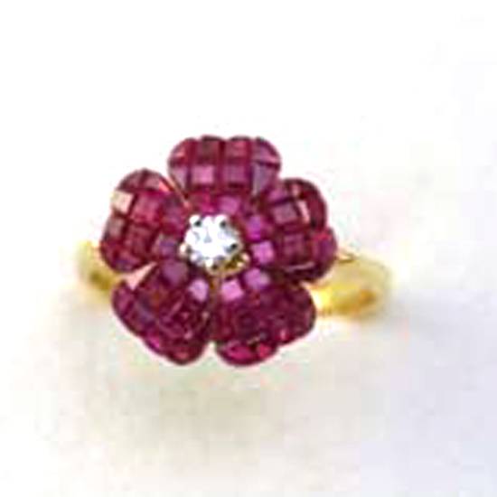 This ring is made of red gemstones in flower design. A diamond is set at the center which makes a big contrast with the red gemstones for its own transparency. The golden shank is in brushed polish.