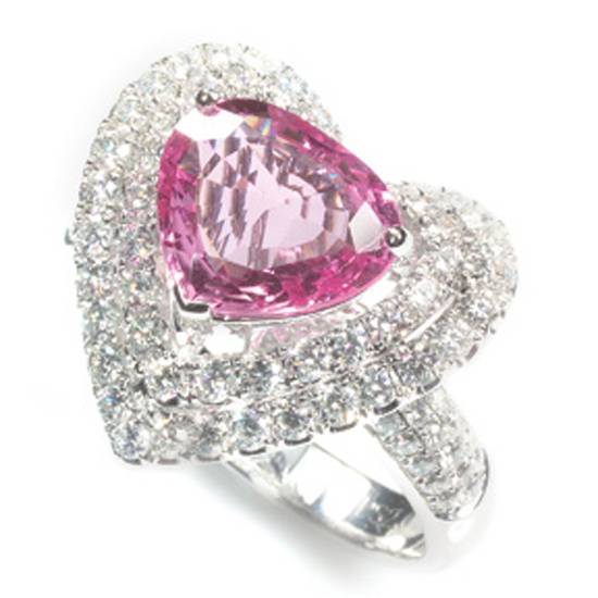 This ring has a pink gemstone surrounded by other small glittering diamonds. The heart cutting of the pink gemstone is in a 3-prong setting. Other bead-set diamonds are around it in a heart shape and also along the shoulder of the shank.