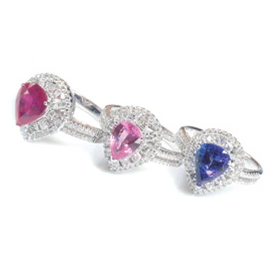 The rings have gemstones at the center in different surrounded with small diamonds. Each ring has a teardrop gemstone in a 3-prong setting. The glittering diamonds are around it in teardrop shape as well and along the shoulder of the shank.