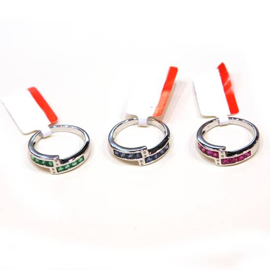 These are three 18K white gold ring with gemstone settings. Square rubies, sapphires and emeralds are channel-set respectively on the upper part of the rings, producing three different styles for you to choose from.