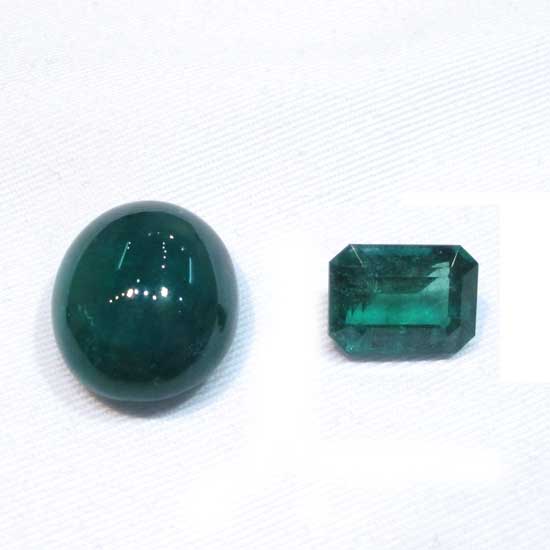 The gemstone set is two pieces of fascinating emeralds respectively in oval and rectangular shapes. Each one is well cut and highly polished with smooth surface and faceted details. They have the beautiful, intense and radiant green that lends a sparkle.
