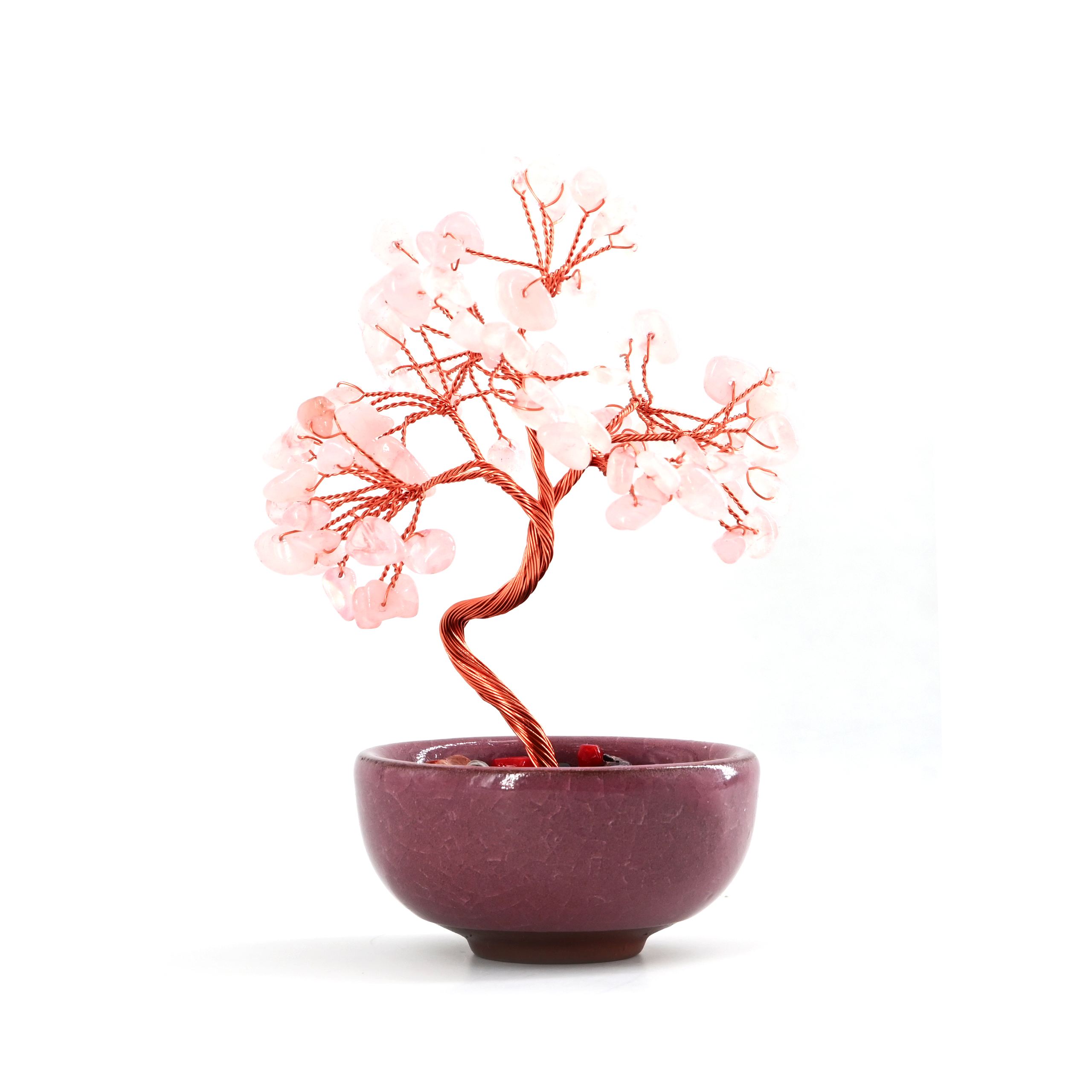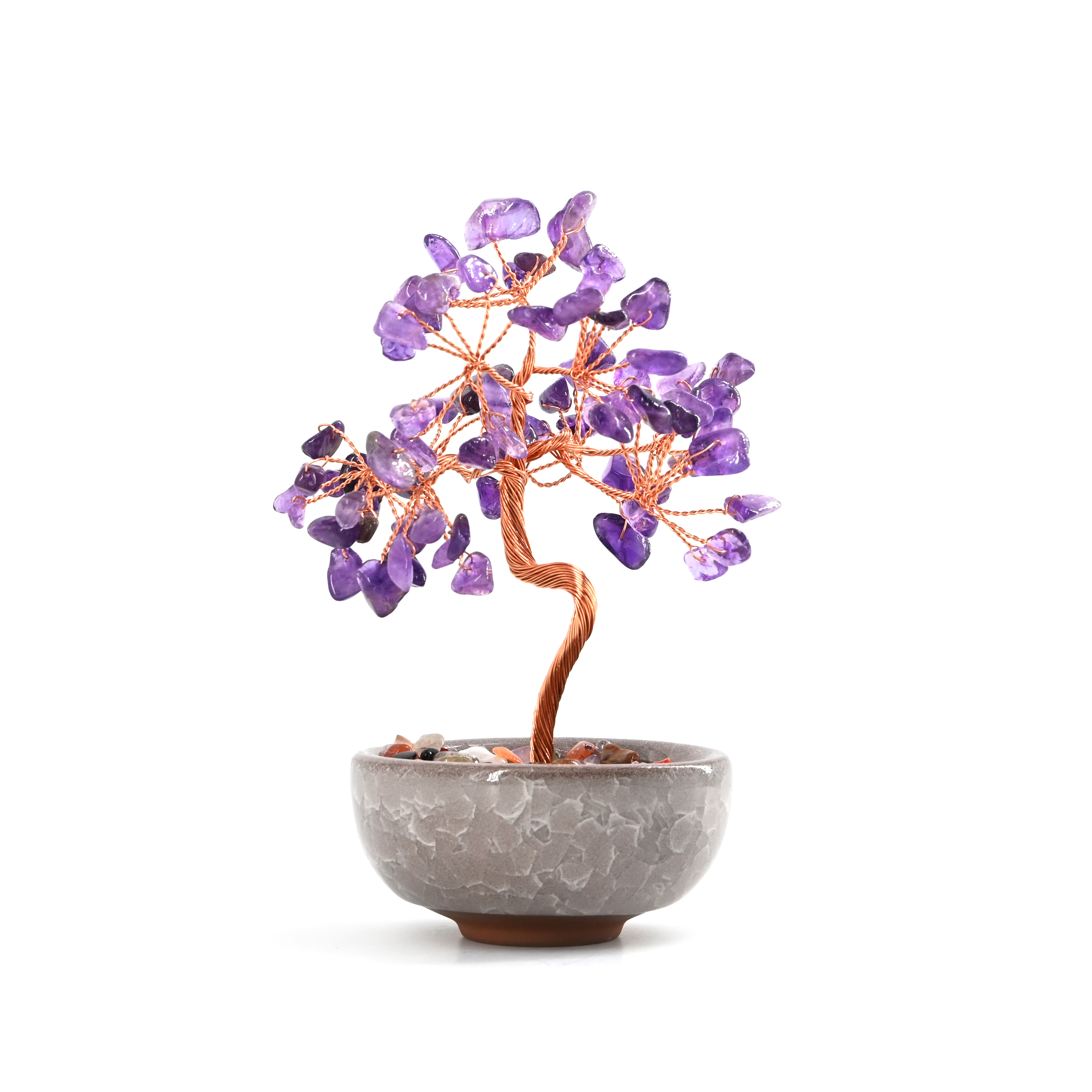 Gemstone trees feature genuine semi-precious stone chips as lush foliage, intricately wrapped on a polished copper wire trunk.