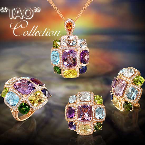 Showcased is a stunning jewelry set including a pendant, a ring and a pair earrings. Each is embellished with carefully cut gemstones and delicate diamonds that shimmer and refract a spectrum of color. The 18K rose gold setting flaunts strong elegance.