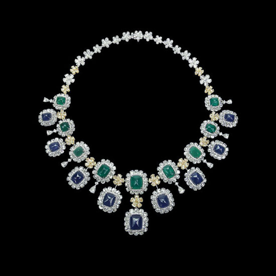 This is a necklace that is inlaid with charming emerald and blue sapphire cabochons. It is finely adorned with sparkling diamond elements for added attractiveness. This dazzling necklace is great formal occasions.