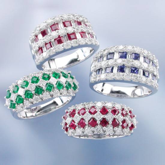 These are gemstone and diamond ring set in 18k white gold. There are two styles of rings. The first one is designed with a row of square white diamonds surrounded by a row of small round cut white diamonds and a row of emeralds or rubies on each side. Another one is designed with small round cut white diamonds and square blue sapphires or rubies on alternating rows.