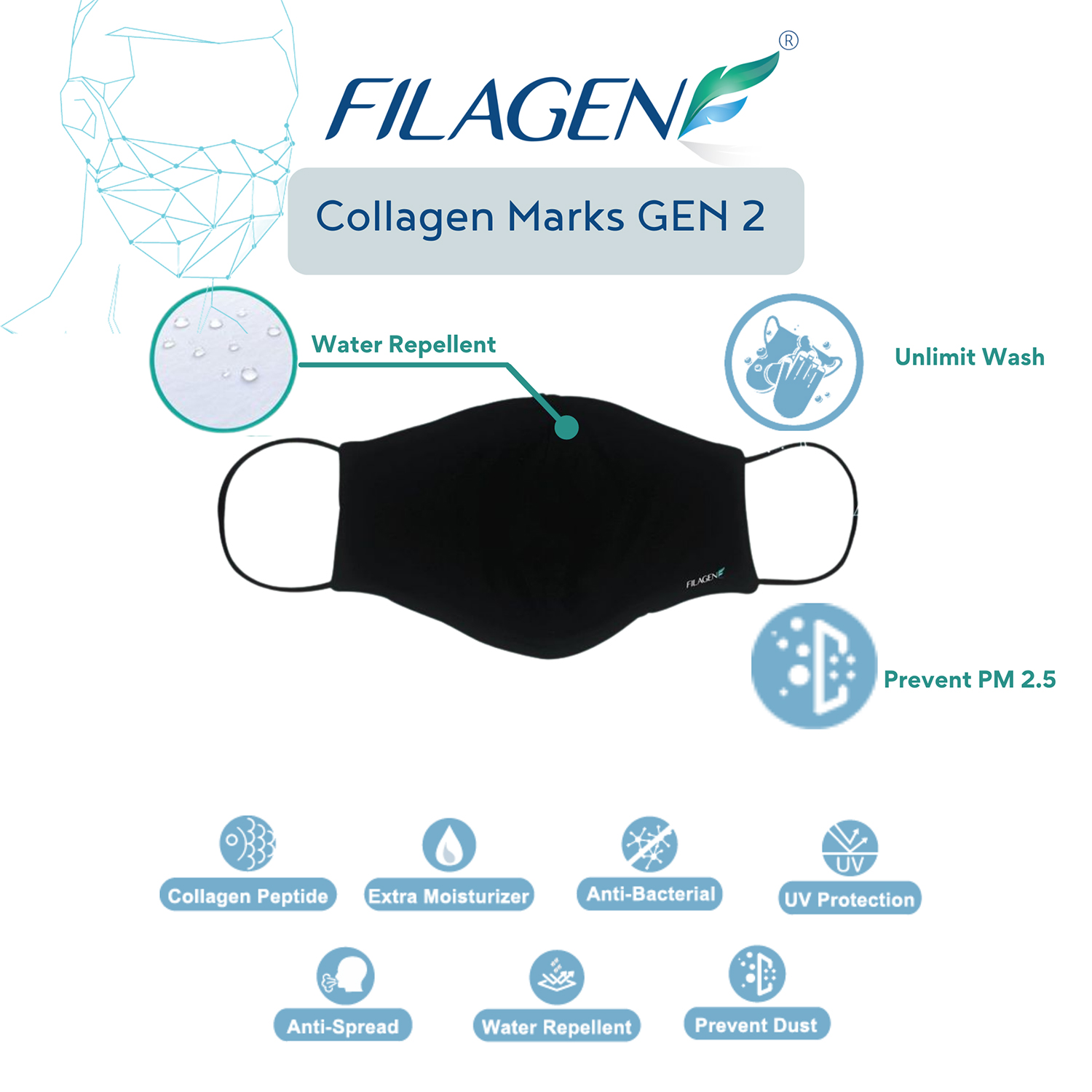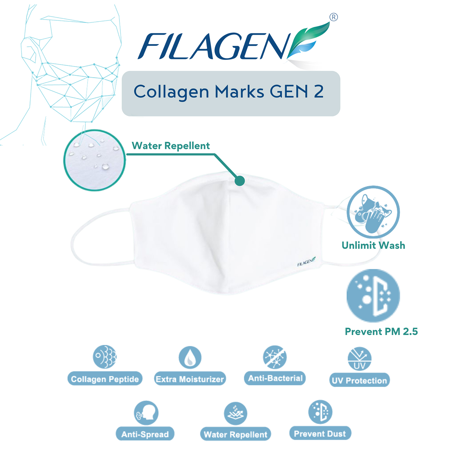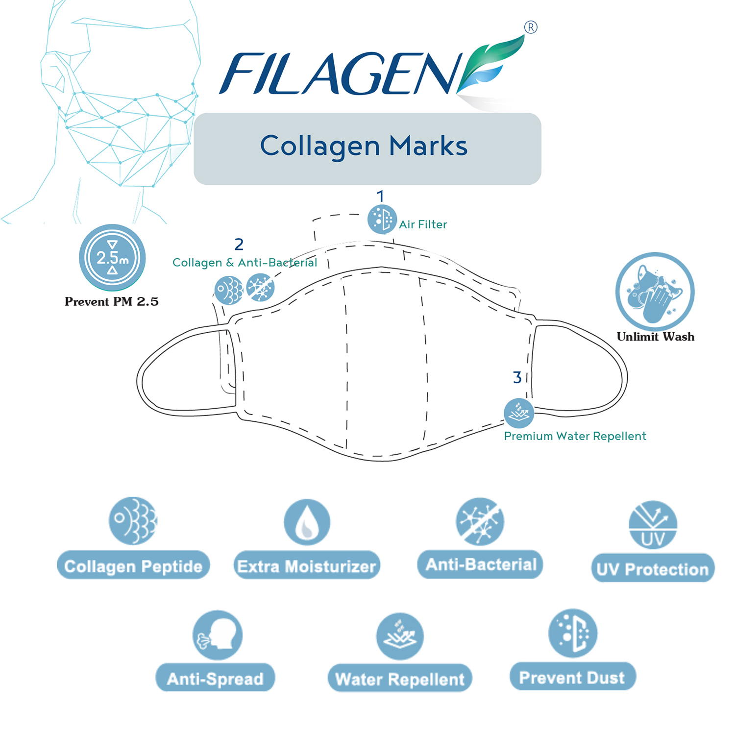 This fabric mask uses collagen fiber technology (FILAGEN) and can help maintain moisture when wearing. It can prevent unwanted odors like damp cloth smell, sweat smell and will stay fresh all day long. The fabric mask provides UV protection function and is comfortable to wear. It can offer protection from outside secretions and can be washed and cleaned more than 30 times without losing collagen functions.