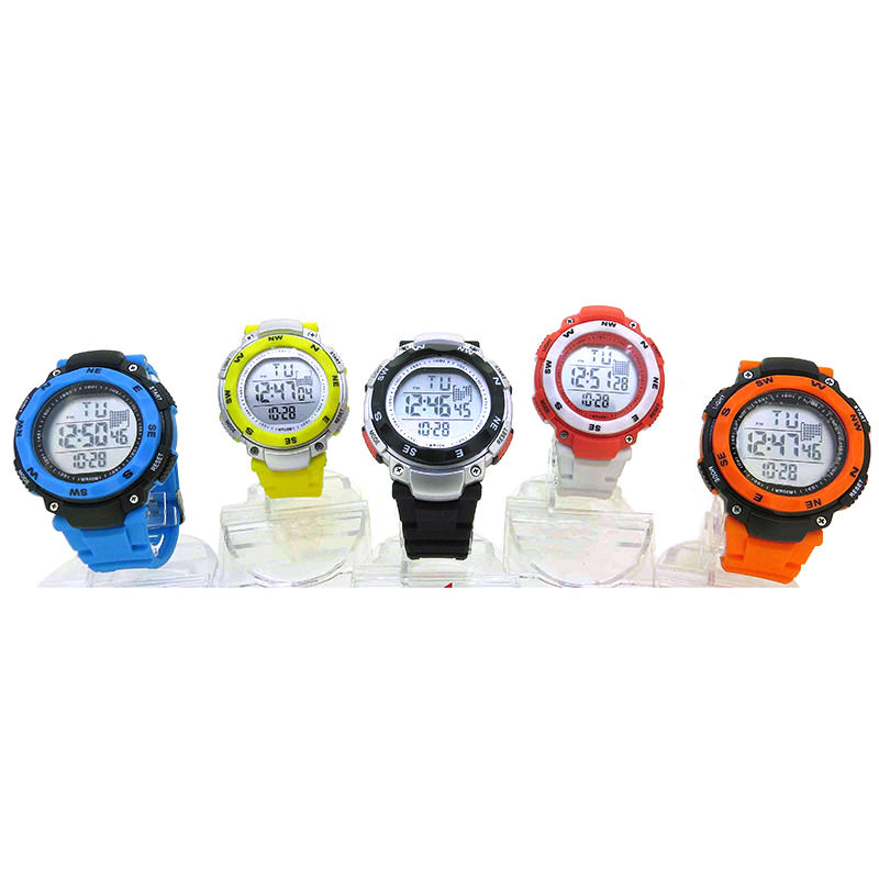 Featured here is a sporty watch with a round, two-tone bezel. This watch is crafted with a 12-digit LCD display for a precise indication of time, while additional functions like auto calendar, chronograph and alarm ensures perfect timekeeping for your working routine.