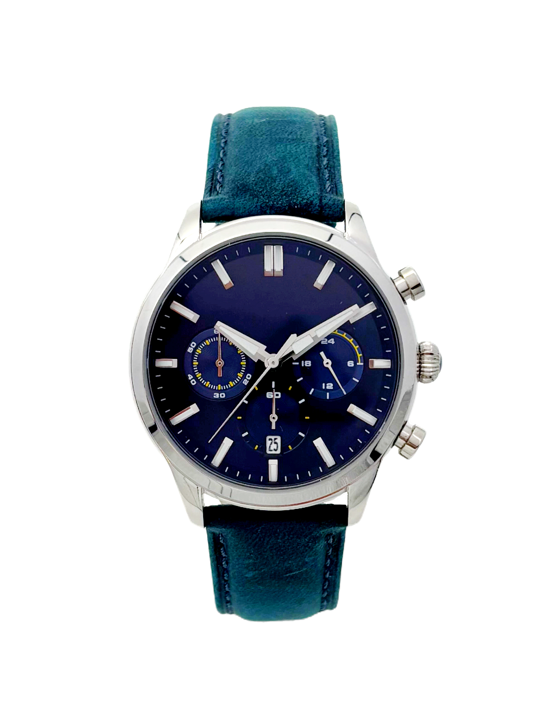 Navy Blue upon Stainless Steel Strap. This cool and confident collection emanates the mark of a 'Gentleman'.