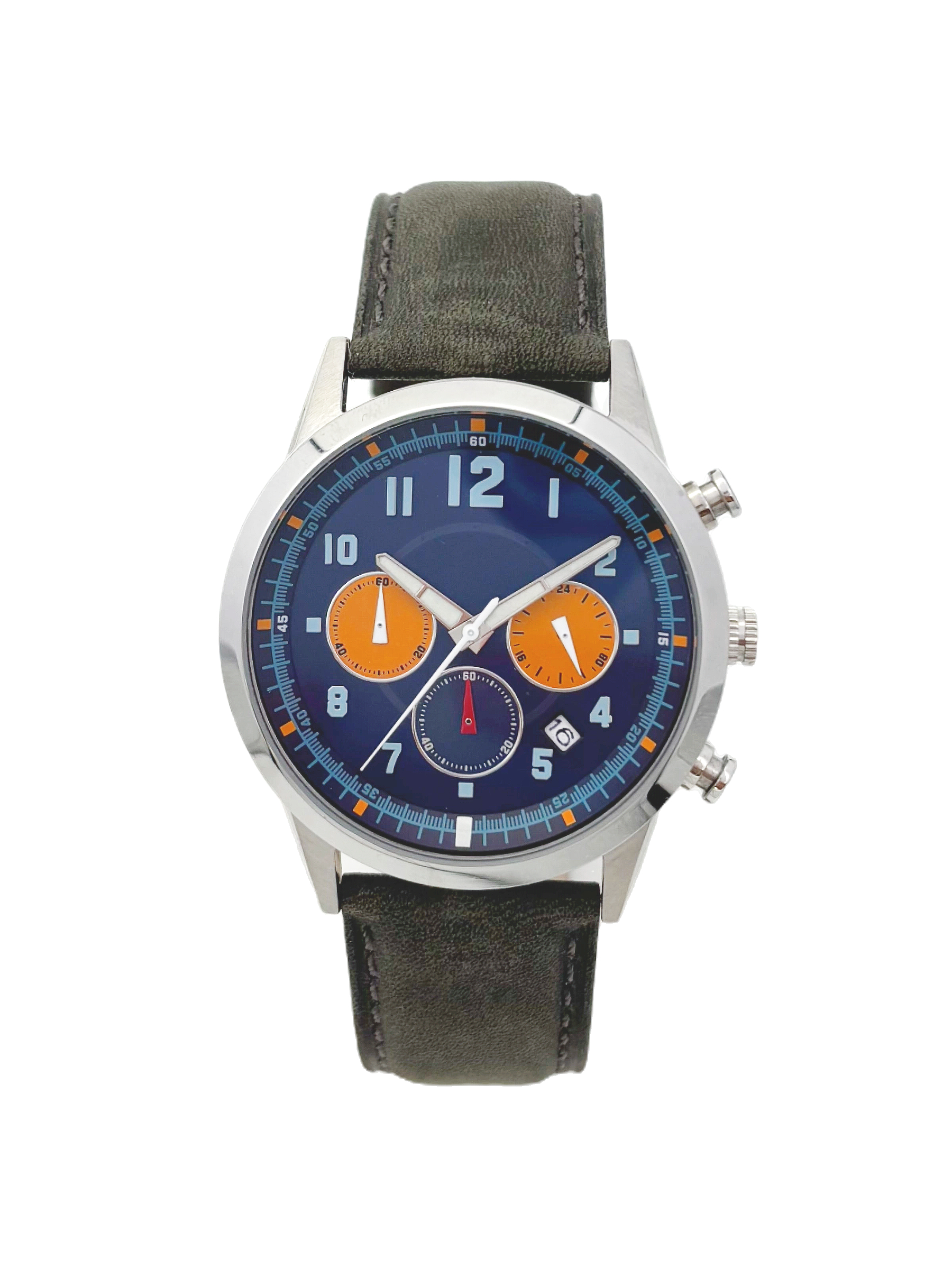Navy Blue upon Stainless Steel Strap. This cool and confident collection emanates the mark of a 'Gentleman'.