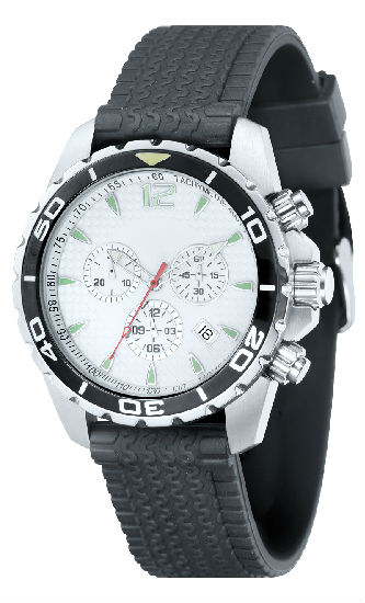Blending Swiss craftsmanship with chronograph functionality, this rounded gentlemen’s timepiece boasts a beveled tachymeter, a date display and 3 subdials powered by Swiss parts chronograph movement. This rugged stainless steel watch sets on a tire tread textured, silicone strap that offers maximum wearing comfort. Resistant to rust and water with a depth rating up to 5 ATM, this watch is durably constructed for an extended lifespan.
