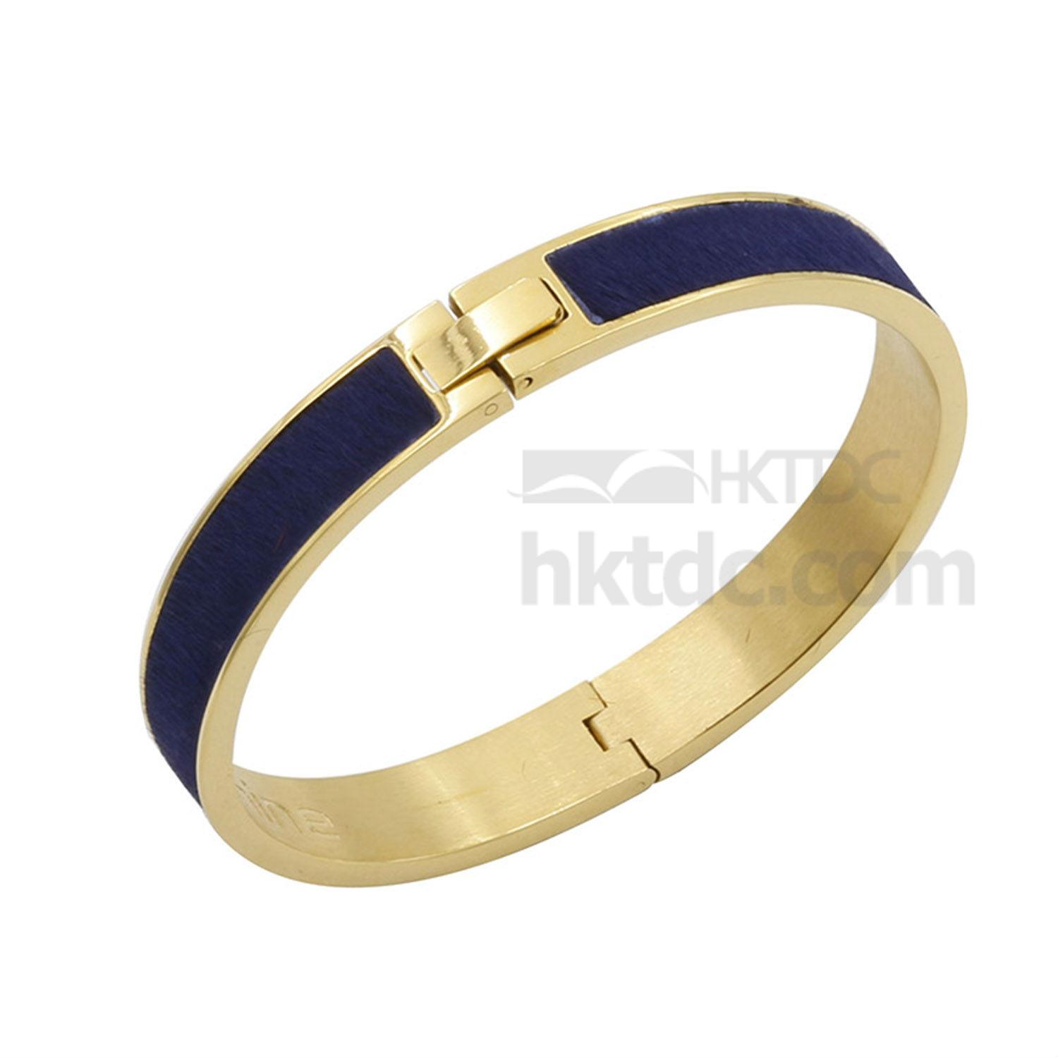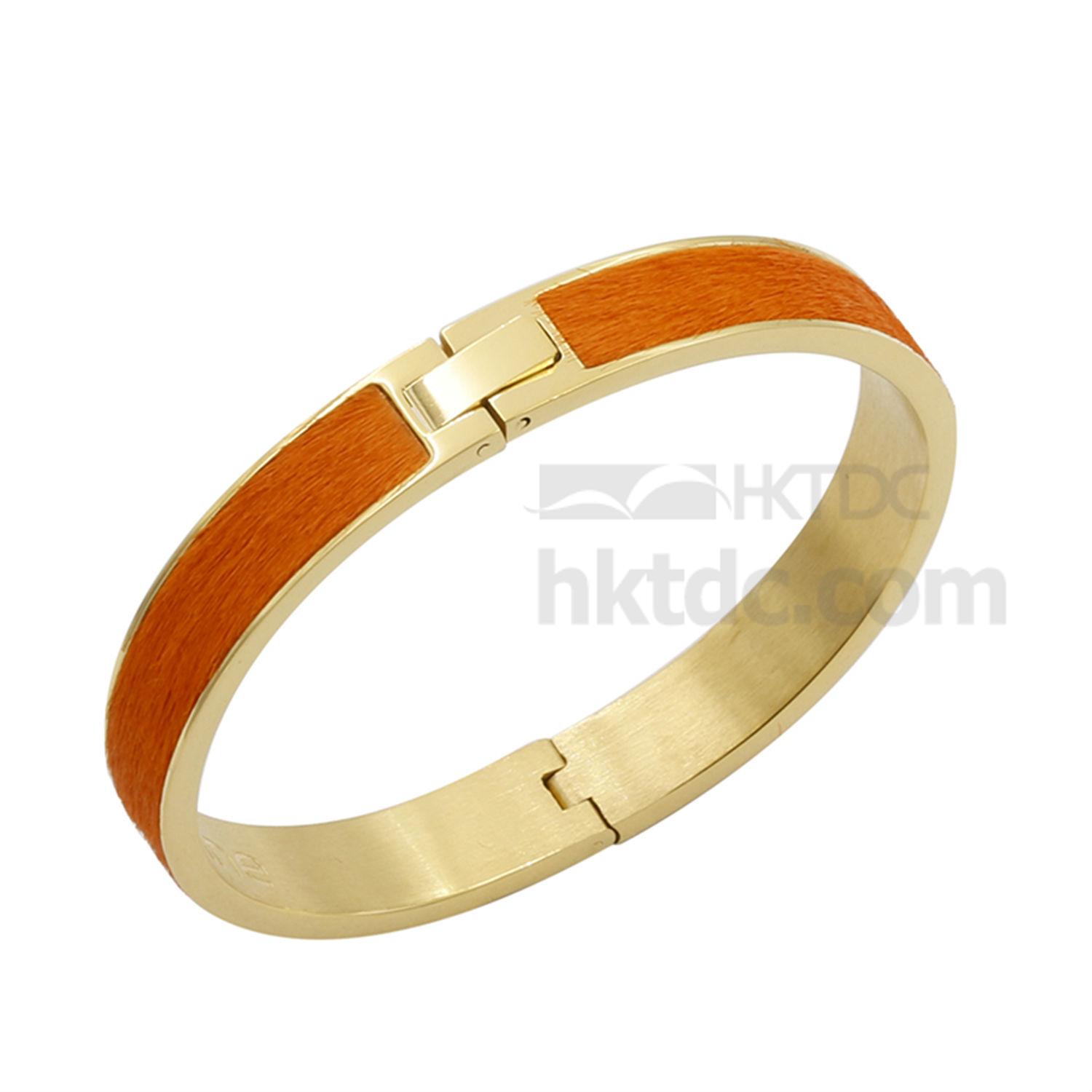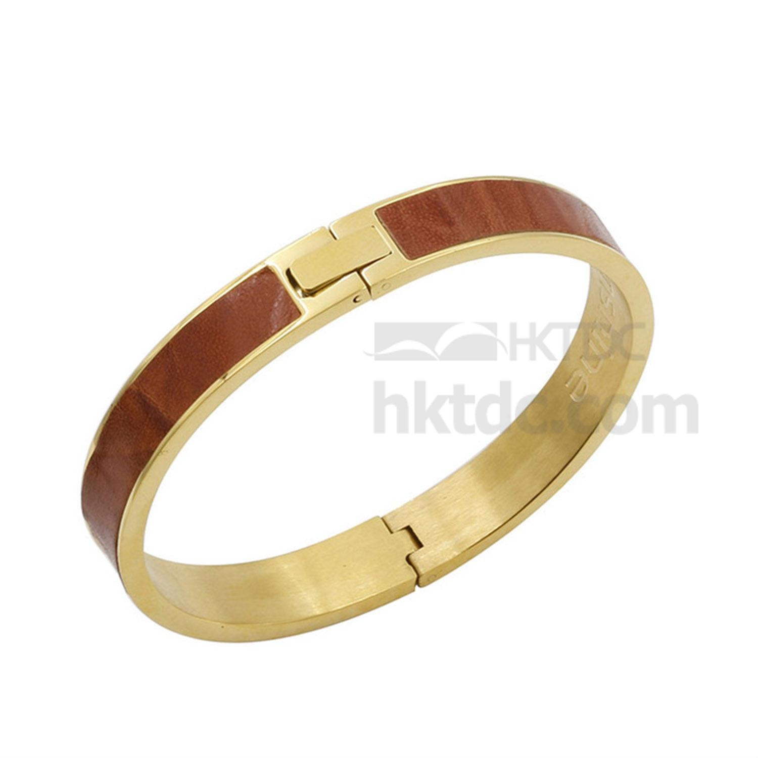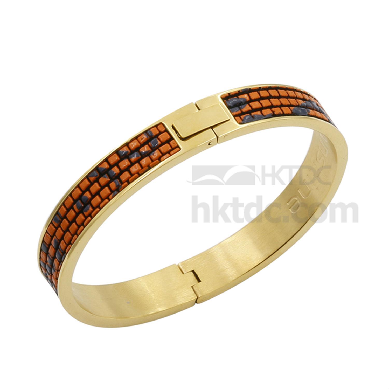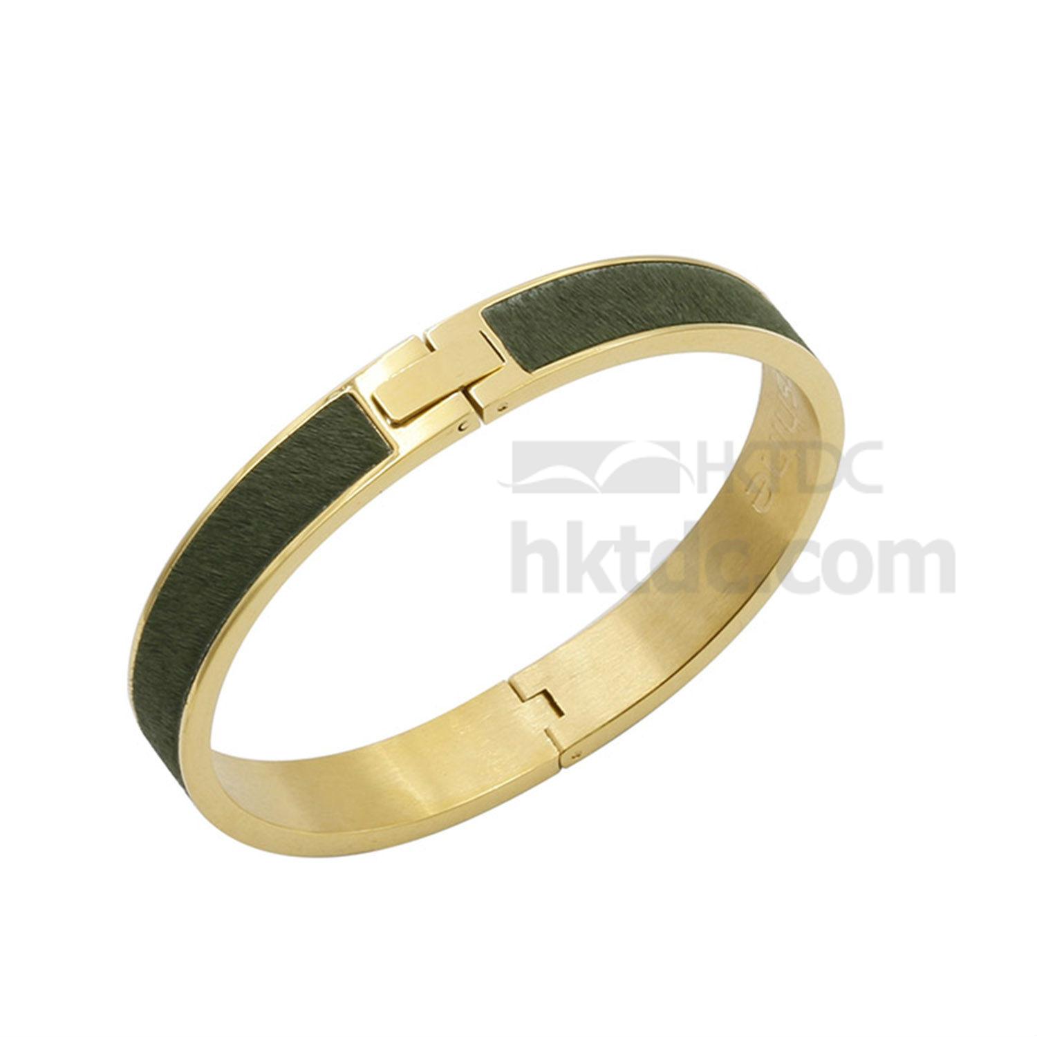 Highlighted here is a bangle made of genuine leather. It comes in an elegant gold tone and is embellished with leather on the surface. This bangle has a clasp for closure and is excellent for everyday wear.