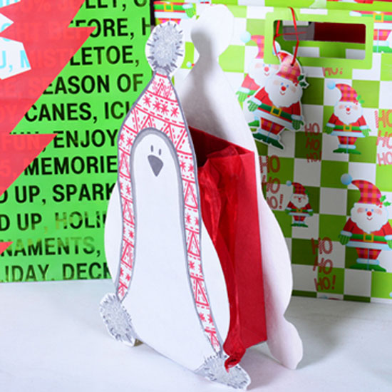This is a gift bag that comes in a festive red color. Featuring a fun shape on both sides, this gift bag is great for Christmas. This gift bag is made of high quality material for durability.