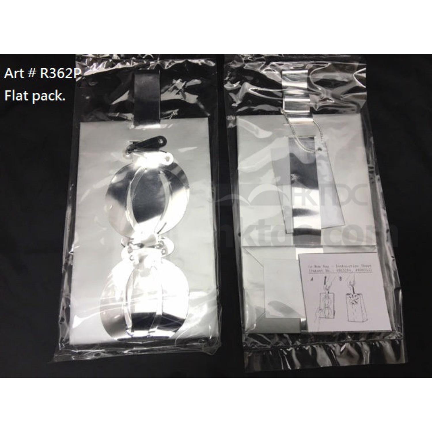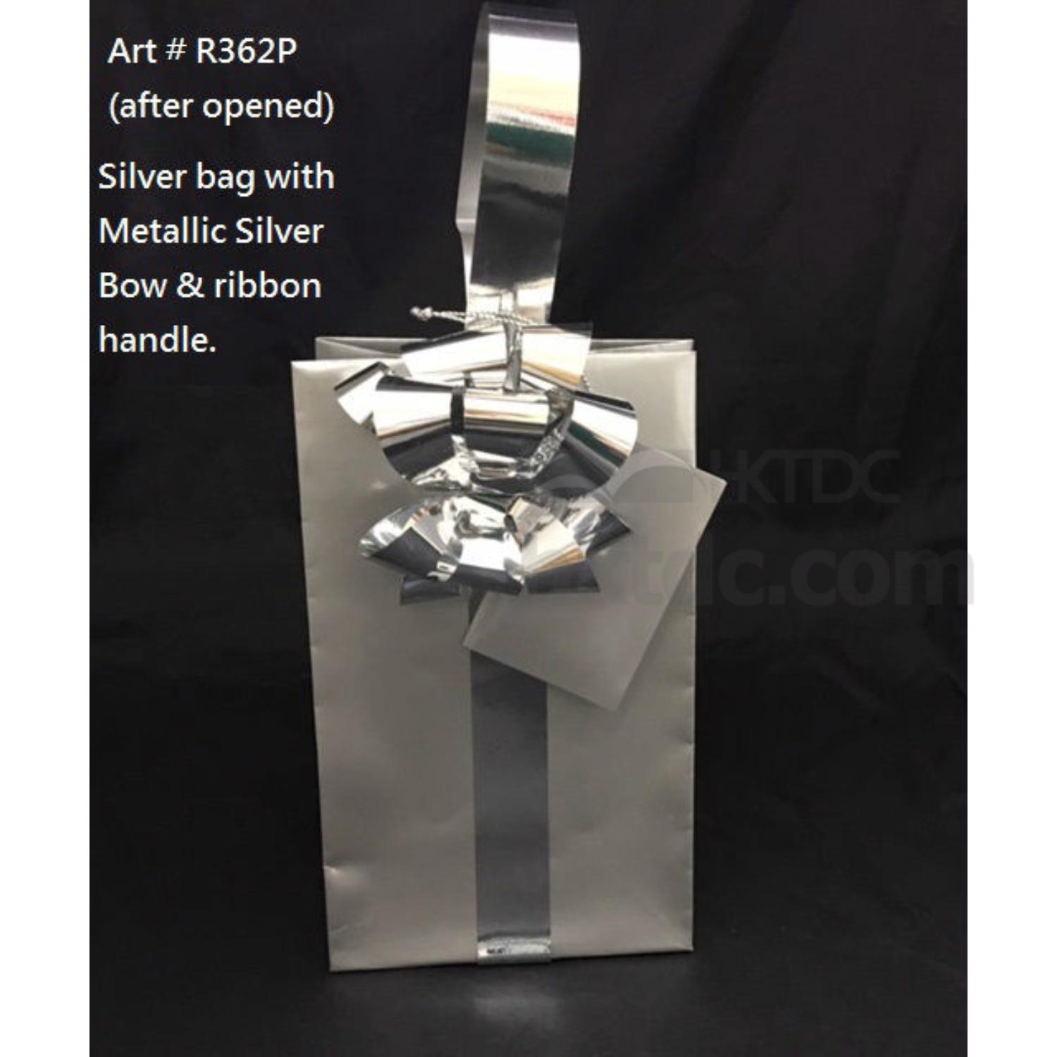 - Silver bag with metallic silver bow & metallic silver ribbon handle.