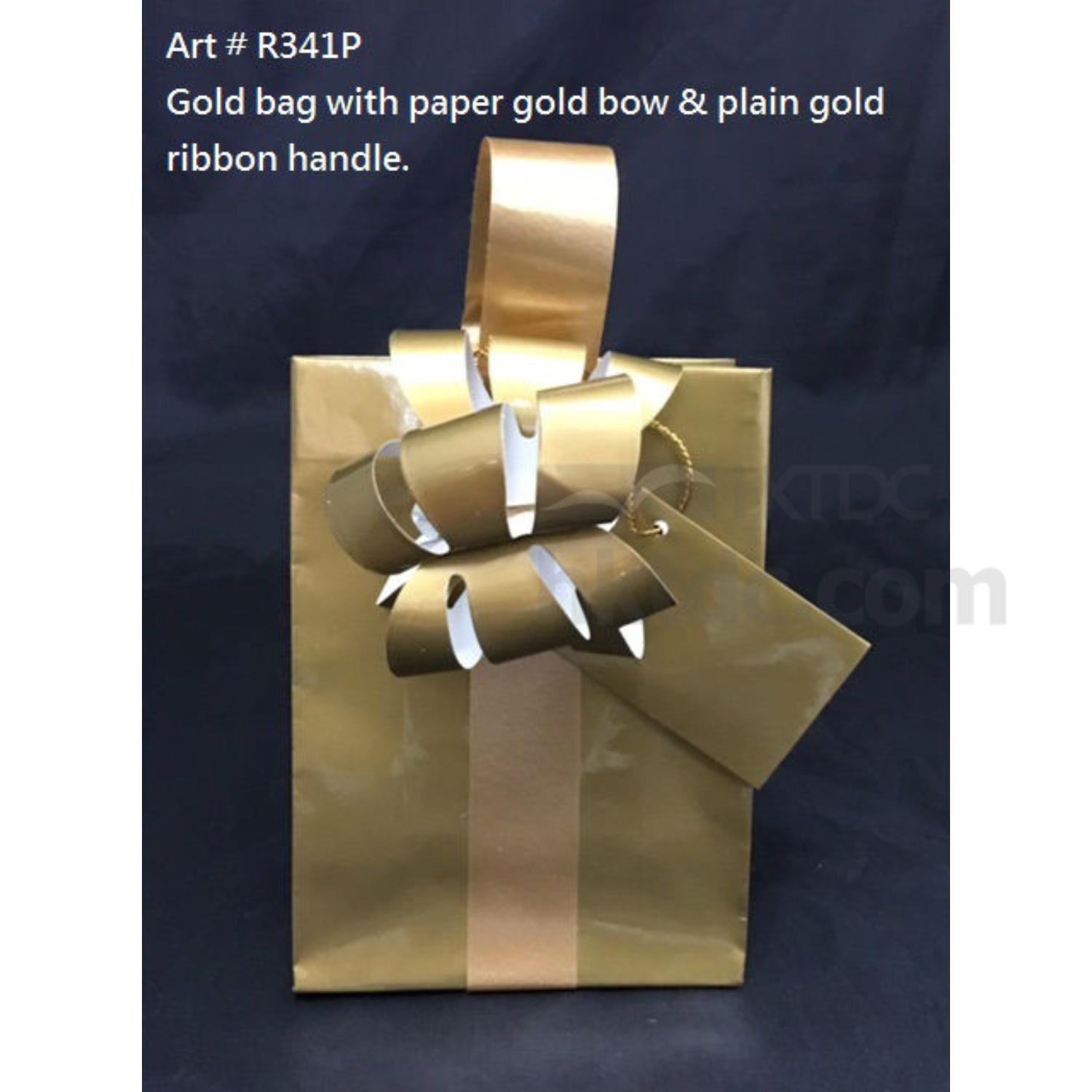 - Gold bag with paper gold bow & plain gold ribbon handle.