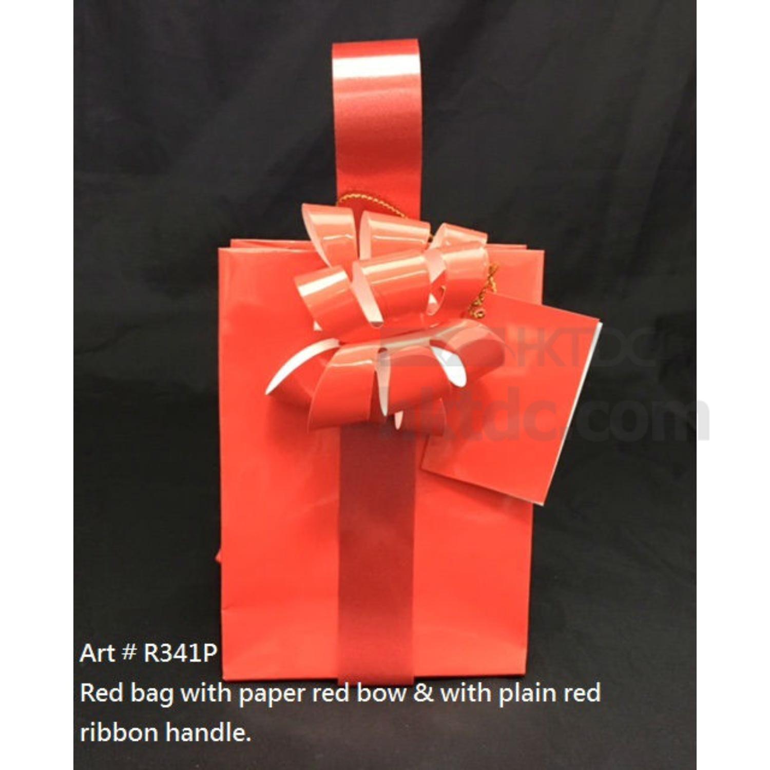 - Red bag with metallic gold bow & metallic gold ribbon handle.