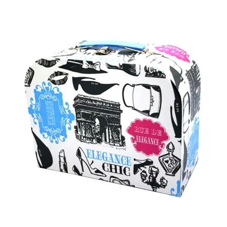 The gift box here is designed in a delicate briefcase shape. The shell features fashionable prints in wonderful colors. Accessories like a metal lock, plastic handle and metal button are added for enhanced style.